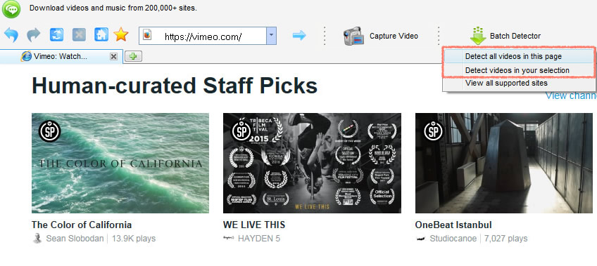 Open the web page you want to download in the browser and click the Batch Detector button.